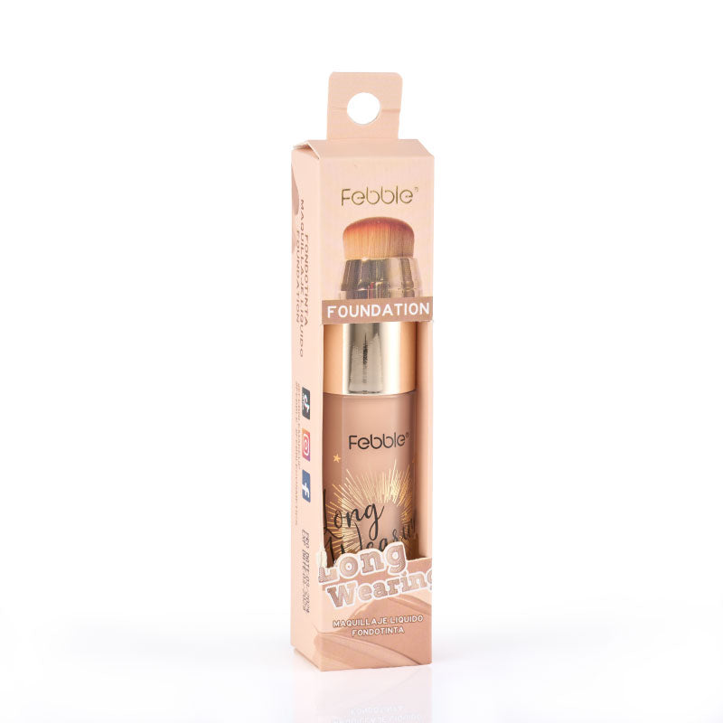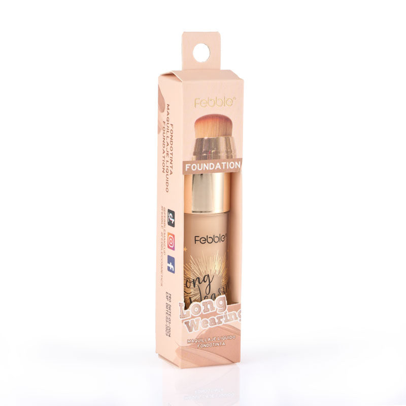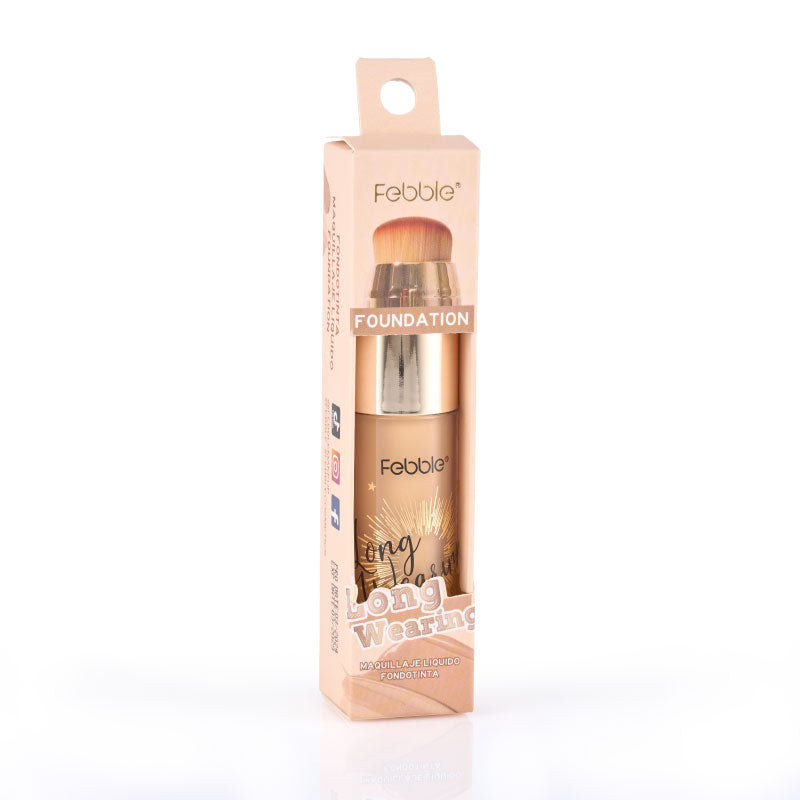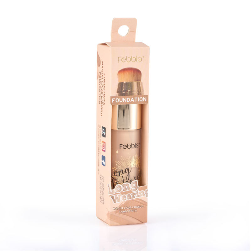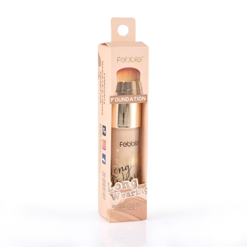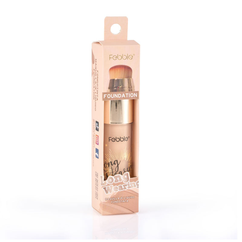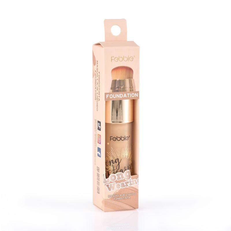 Base de Maquillaje Líquida de Larga Duración, que ofrece Cobertura Total y un Acabado Mate Natural. Se presenta en un envase con aplicador de brocha. Disponible en 12 tonos.