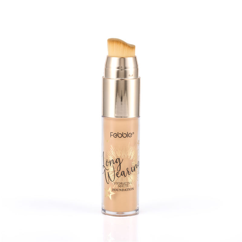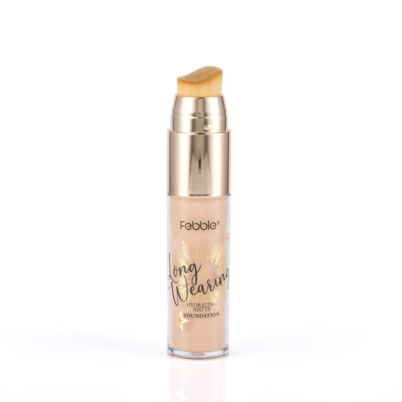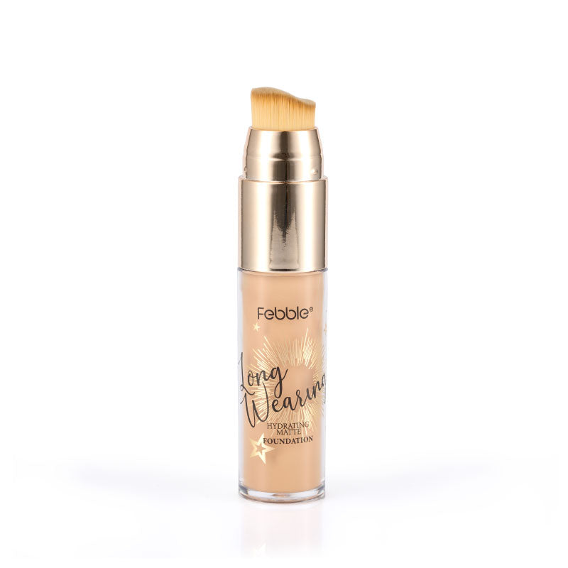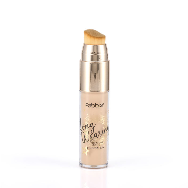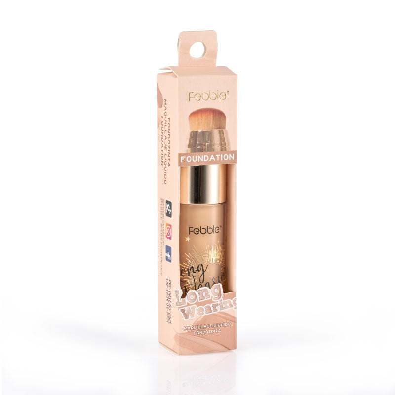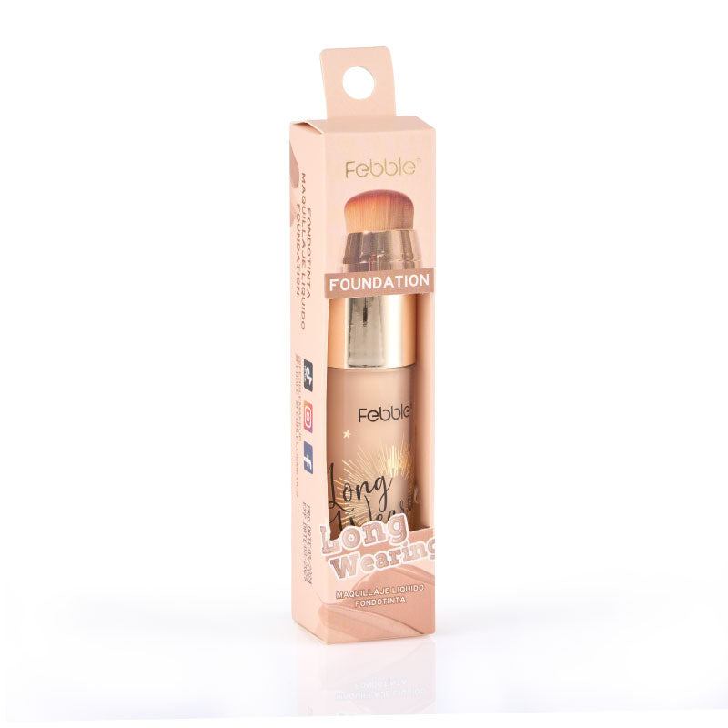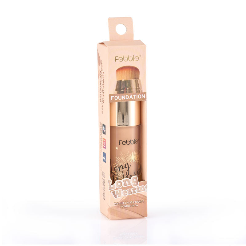 Base de Maquillaje Líquida de Larga Duración, que ofrece Cobertura Total y un Acabado Mate Natural. Se presenta en un envase con aplicador de brocha. Disponible en 12 tonos.