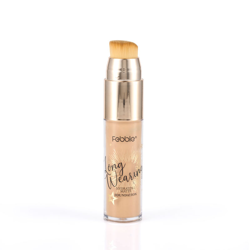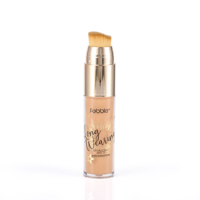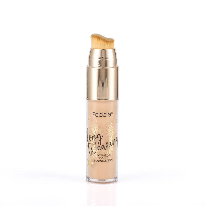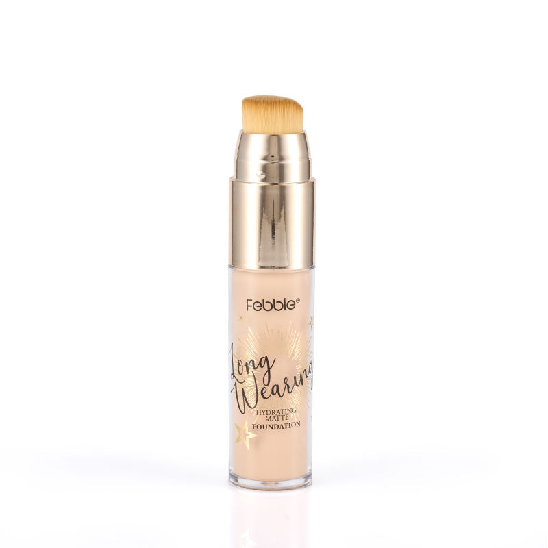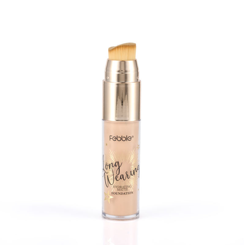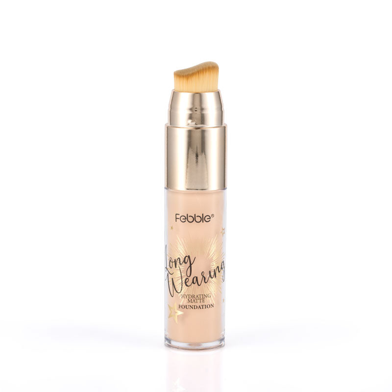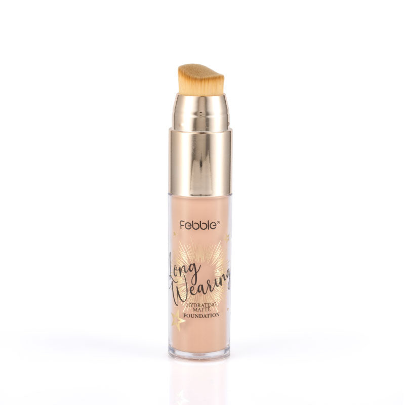 Base de Maquillaje Líquida de Larga Duración, que ofrece Cobertura Total y un Acabado Mate Natural. Se presenta en un envase con aplicador de brocha. Disponible en 12 tonos.