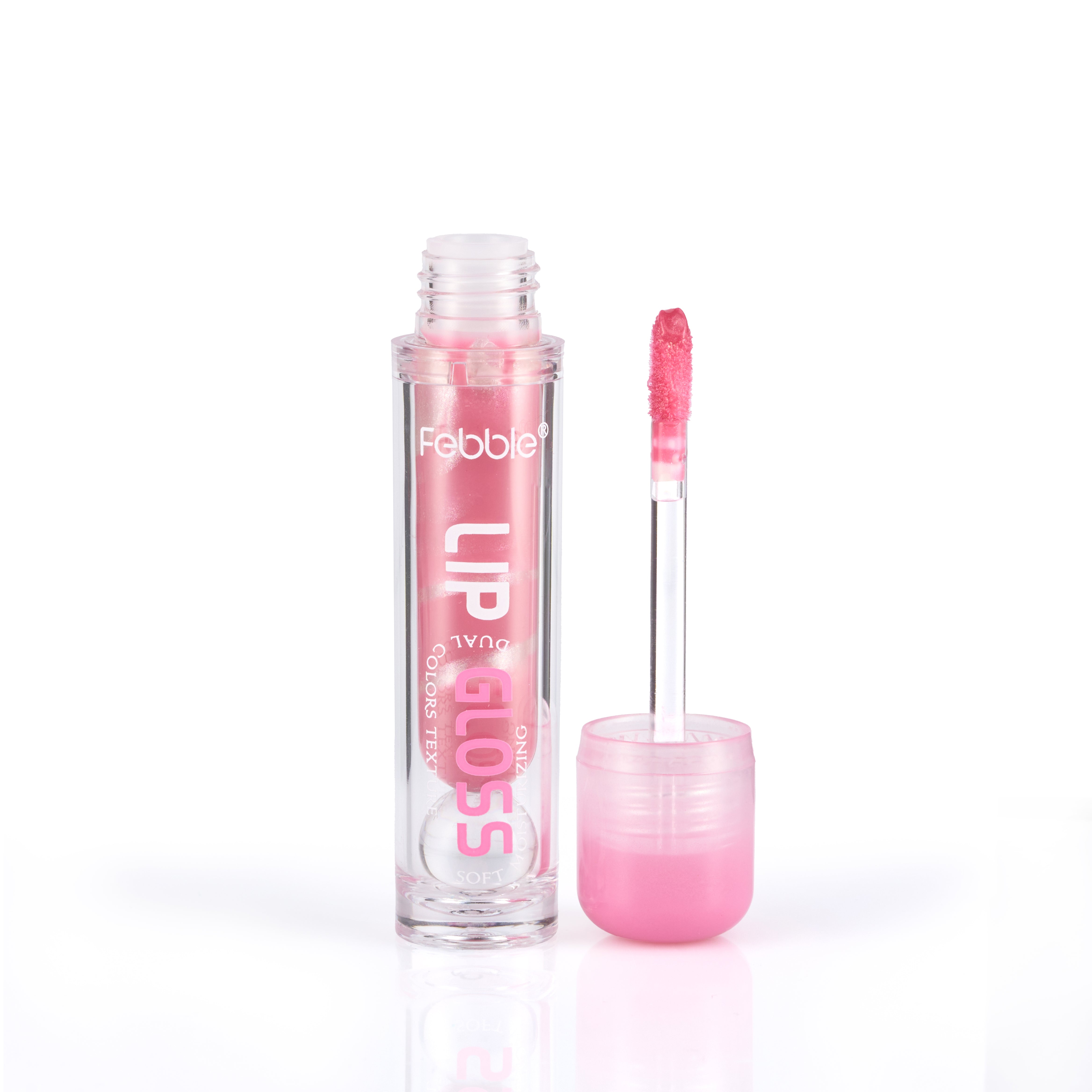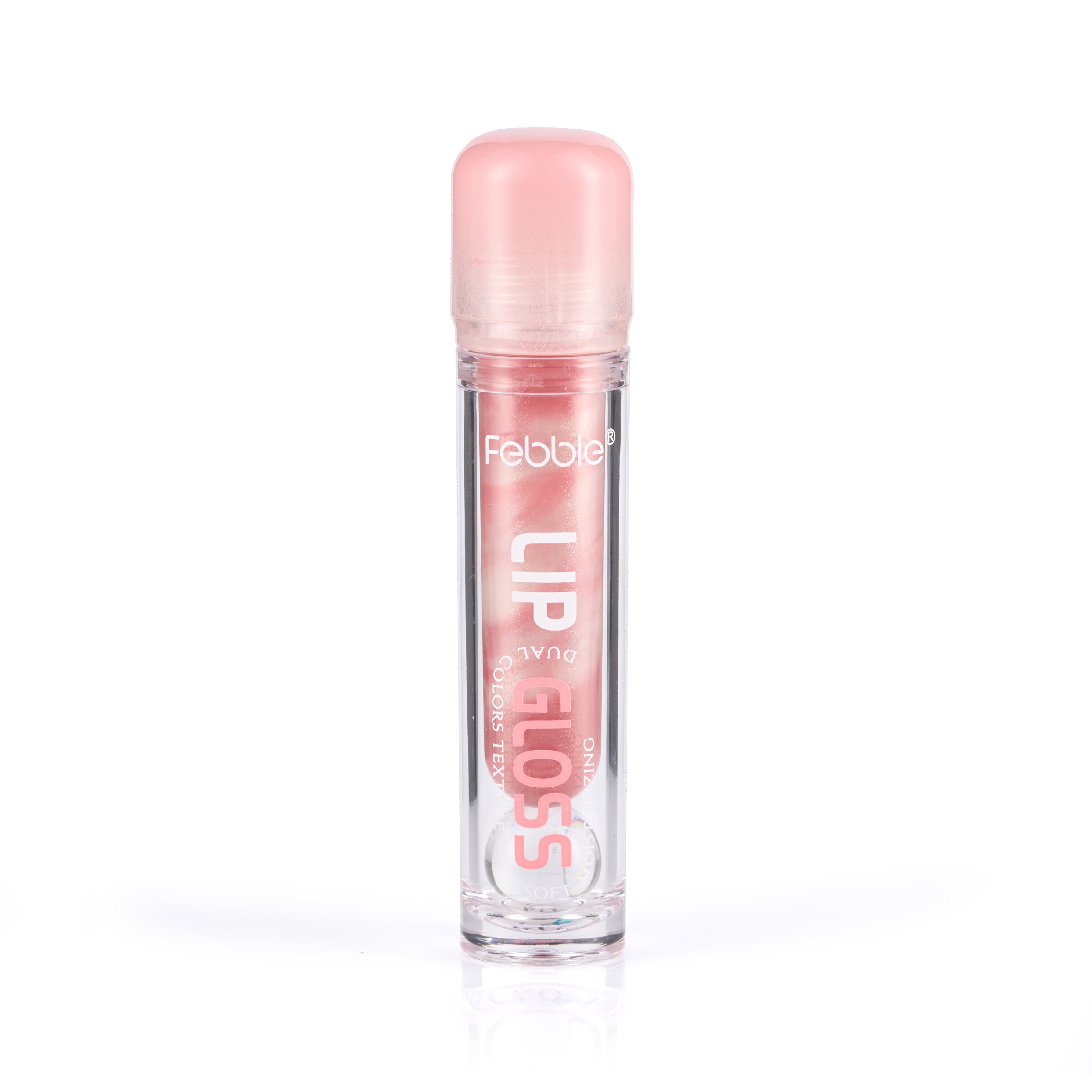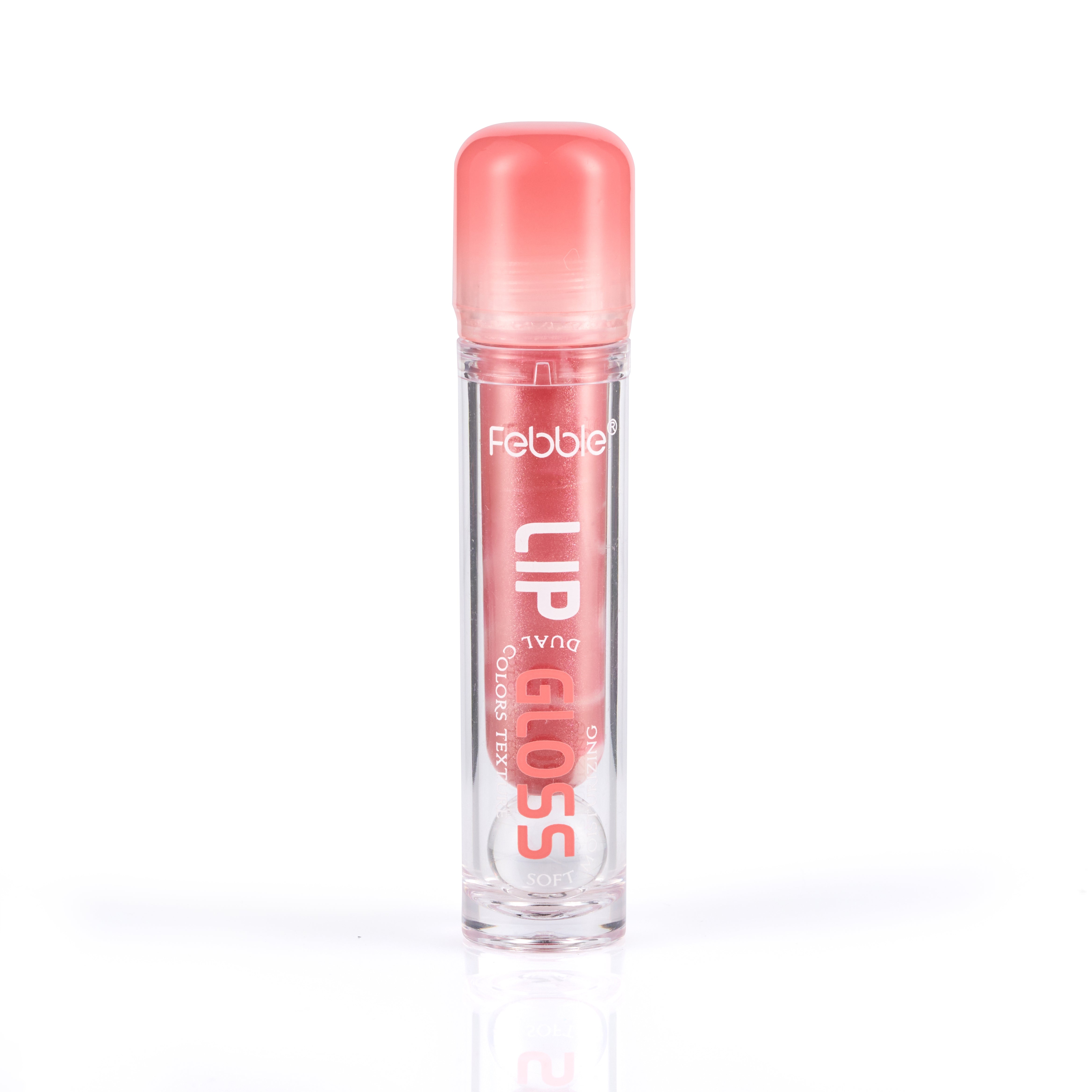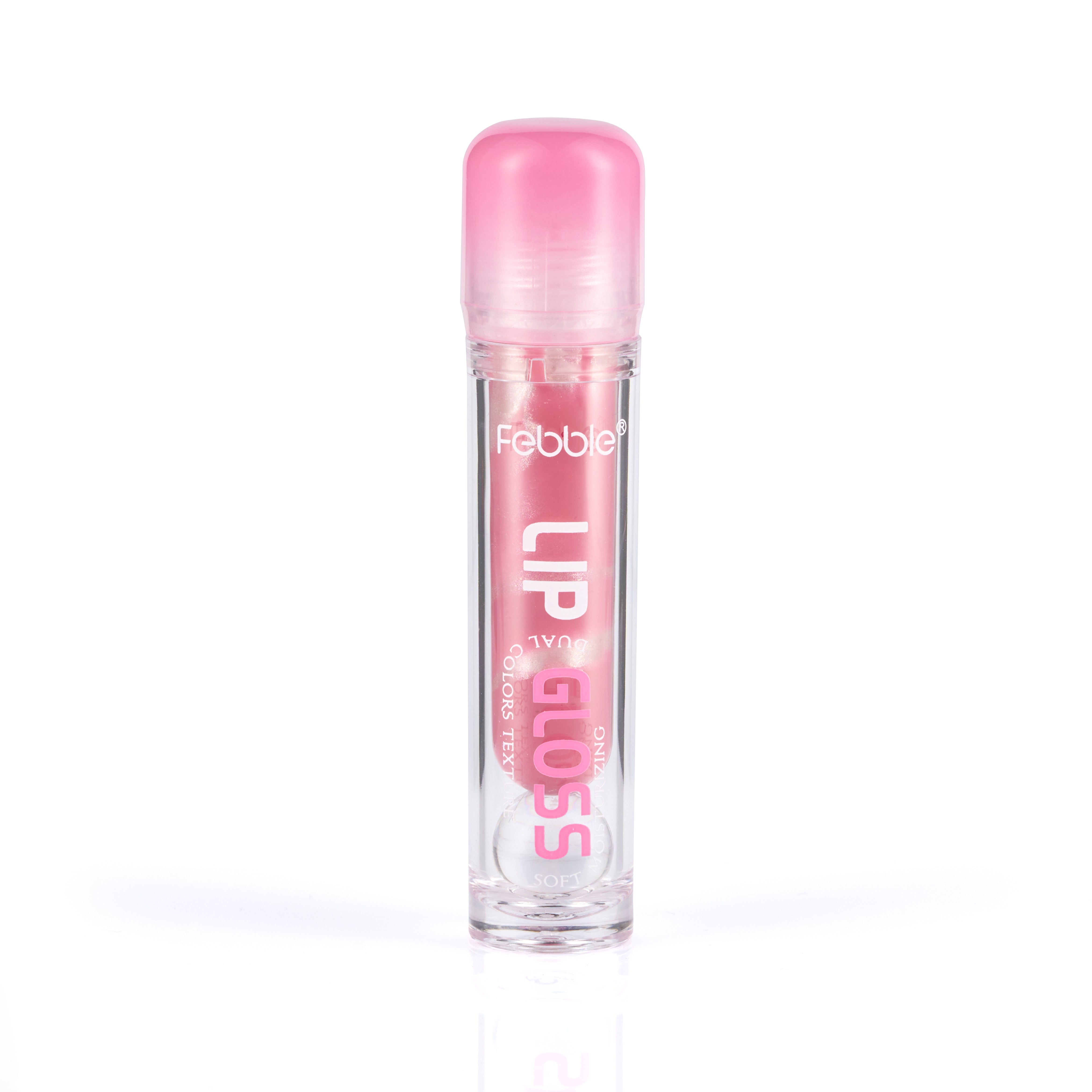 Lip Gloss de Color Mezclado, que ofrece un Acabado Brillante, Suave Hidratación y una Textura de Doble Color. Se presenta en tonos rosados y rojizos. Disponible en 3 tonos